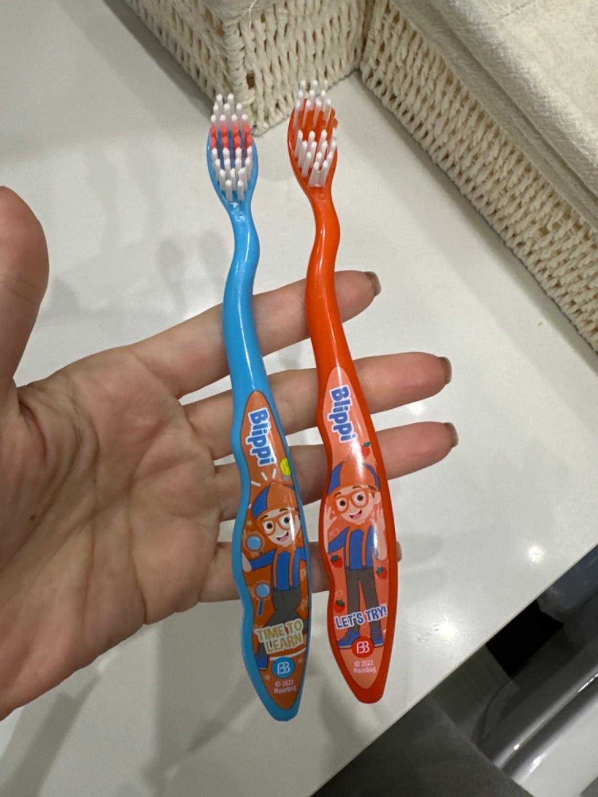 My toddler loves the Blippi 2-pack manual toothbrushes! The bright colors and small heads make brushing so fun and easy!