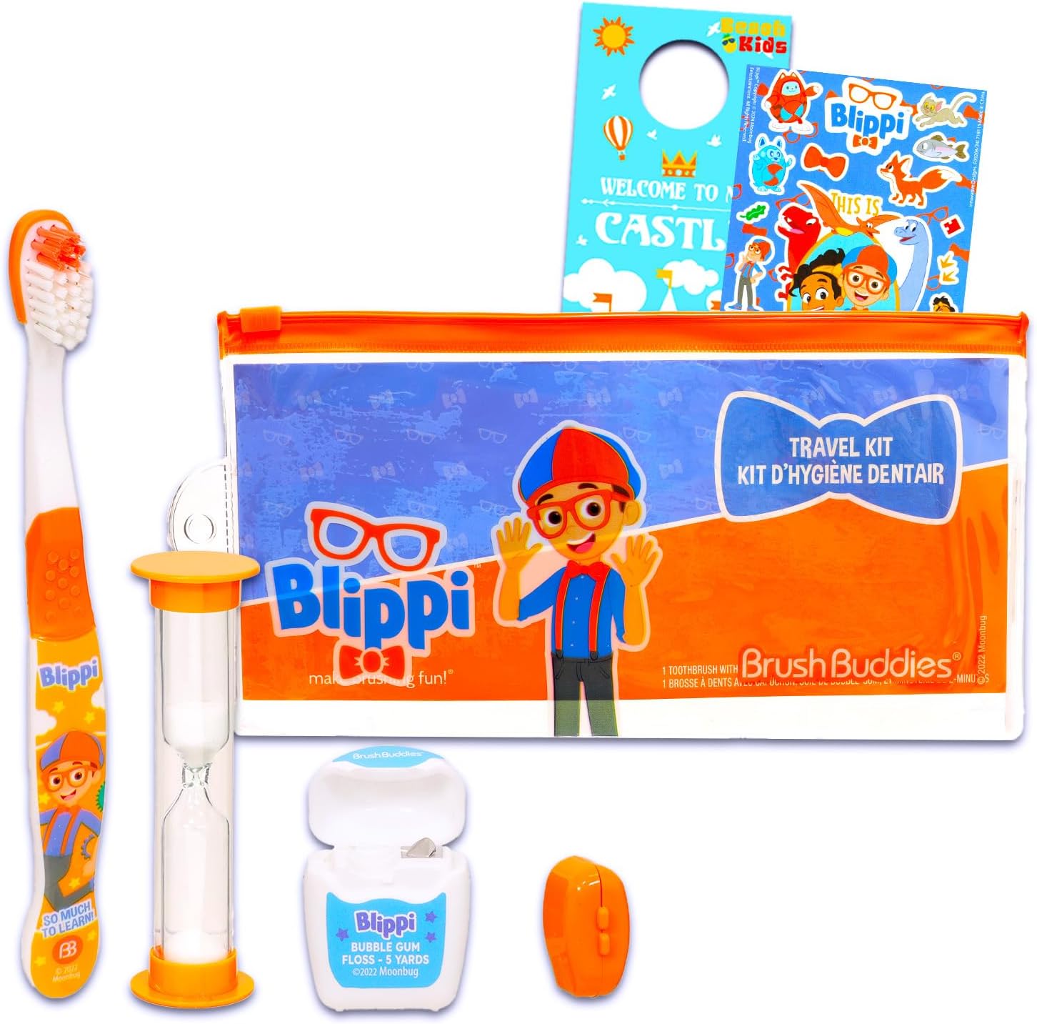 Blippi’s Travel Kit (5x4x0.4 in., 3.2 oz) includes a manual toothbrush, cap, floss, timer, bag, and stickers. For ages 3+, TSA-approved, Blippi designs. 1-year warranty.